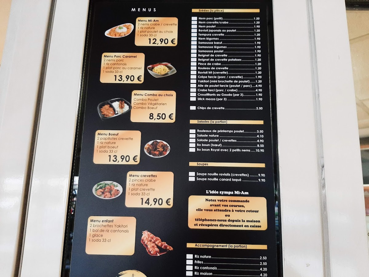 The menu at Mi-Am Grasse offers a delightful blend of flavors, showcasing both French and international influences. One of the standout dishes is the Riz Au Curry, a fragrant and rich curry rice that perfectly balances spices with tender rice. Another great option is the Brochette de Boeuf Caramel, where the caramelized beef skewers offer a sweet-savory experience that's hard to forget. For those craving more variety, the Riz Cantonais provides a deliciously satisfying fried rice, often paired with an assortment of meats or vegetables, while the Nouilles Sautées brings an appetizing stir-fried noodle dish, packed with vibrant ingredients.